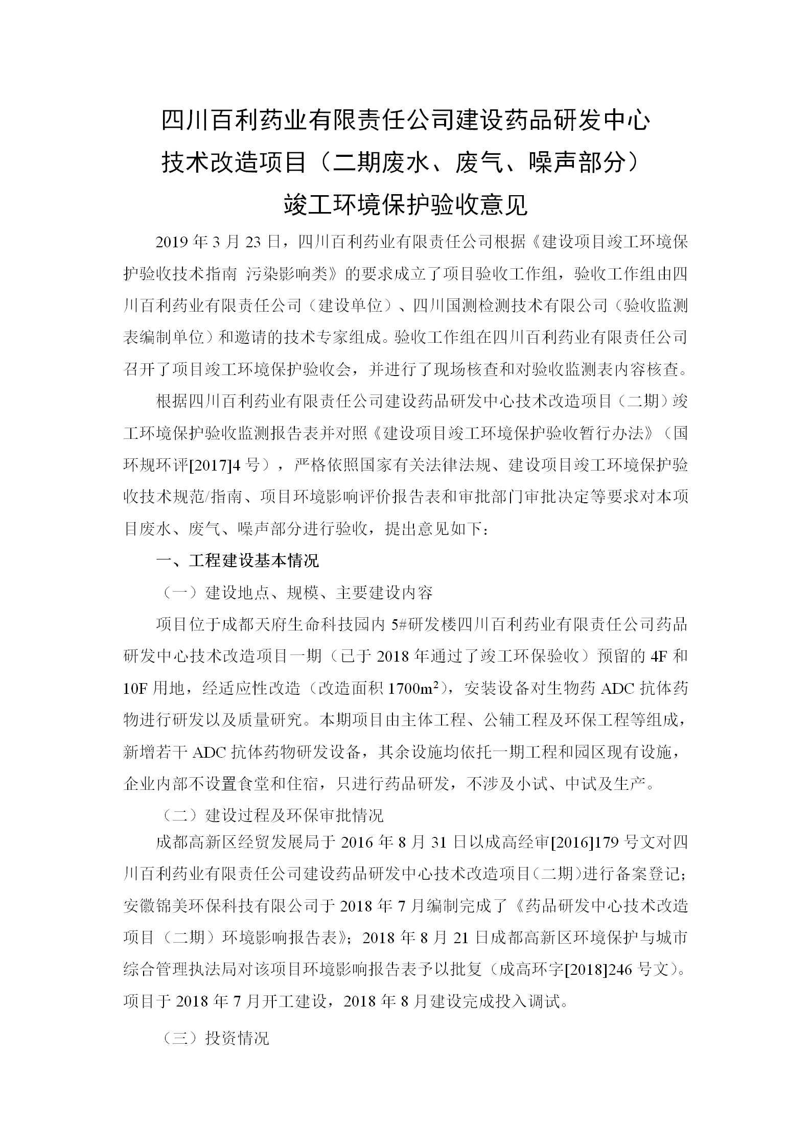 根据《国务院关于建设项目竣工环境保护管理条例的决定》以及环保部《建设项目竣工环境保护验收暂行办法》的公告(国环规环评[2017]4号)现将《四川爱游戏(ayx)体育官方网站-ayx.com有限责任公司药品研发中心技术改造项目(二期)竣工环保验收监测报告》及验收意见公示如下: